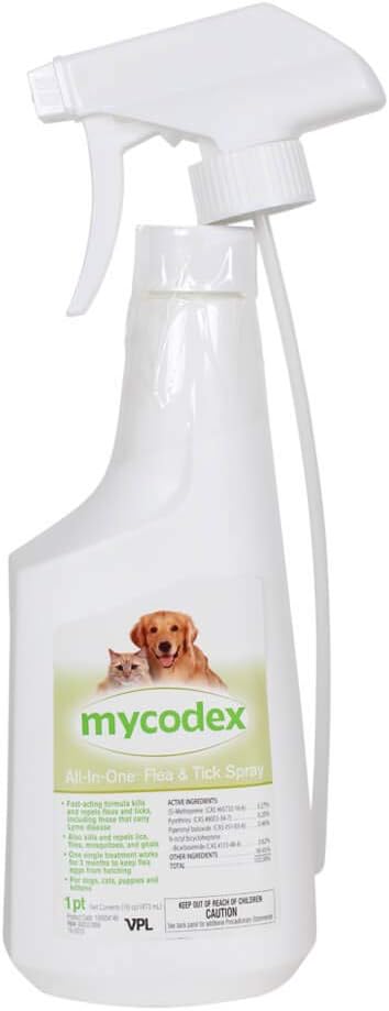 Kills fleas and ticks for more than three weeks plus it gives two months control of the flea eggs. An evenly applied fine mist spray is sufficient. Mycodex All-in-One Spray kills fleas and ticks fast while also repelling against flies mosquitoes and gnats all while leaving your pet smelling fresh.