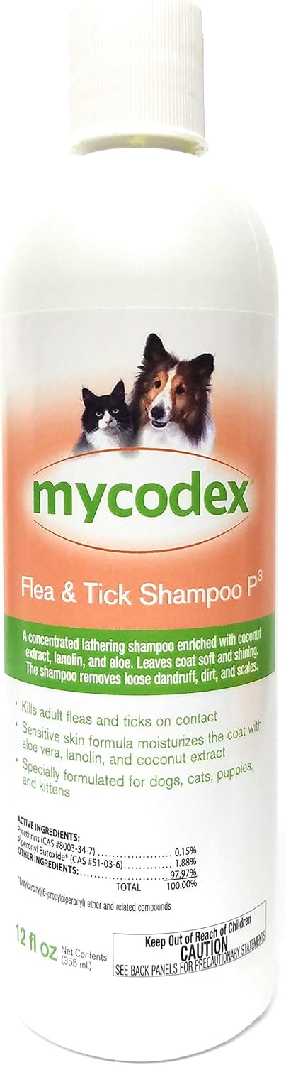 Mycodex All-in-One Flea Tick Spray is a fast-acting formula that kills and repels lice flies mosquitos gnats fleas and ticks including those that carry Lyme disease. Insecticide IGR waterproofing agent and repellent all in one spray for dogs puppies cats and kittens. Mycodex Pet Shampoo with 3x Pyrethrins.