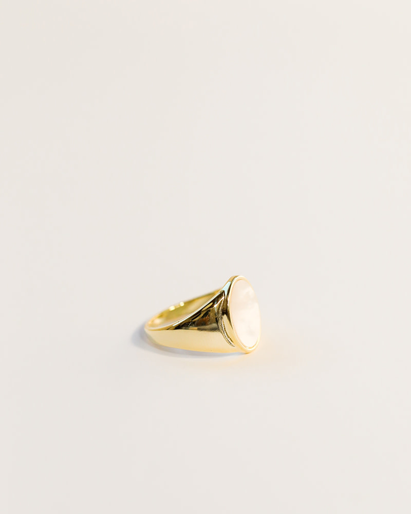 It is a stress relieving stone. Pearl signet gold ring 18k tarnish resistant modern mother of pearl ring minimalistic pearl ring gold ring stack round gold signet ring. This classic feminine style comes in silver and rose gold finishes and features a timeless signet design filled with a shimmering Mother of Pearl stone.
